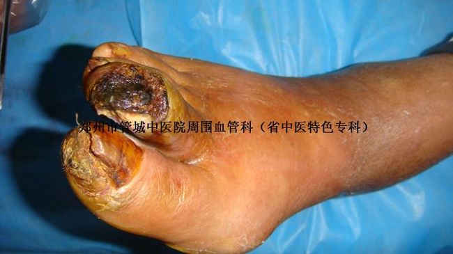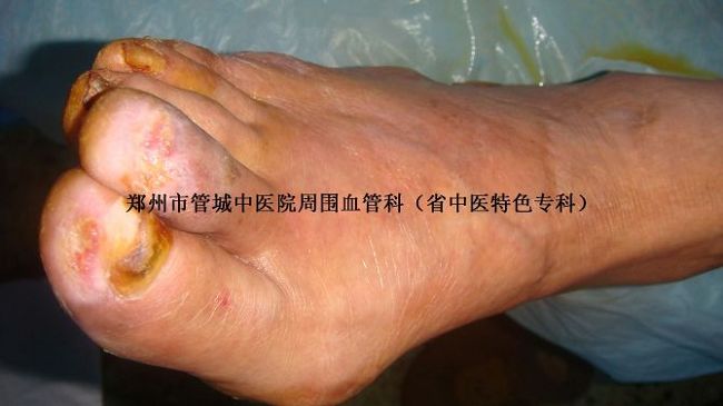 金**,82岁,河南商丘市人。双足发凉怕冷,间歇跛行三年,双足疼痛溃烂一个月入院。患者神智清,精神差,表情痛苦。自诉近二十天来,疼痛剧烈,于晚上加重,难以入睡。入院后查体:双下肢肌肉萎缩,肌肉松软无弹性,皮肤干燥,右足拇趾及第二趾坏疽。左足第二趾肿胀,趾端发黑有一溃口约绿豆大。双足足背及胫后动脉消失。入院后,给与通血保系列药物及中药内服,外敷消疽散,并及时给与中医化腐清创术。入院后第四天,疼痛减轻。住院治疗近两个月,老人的双足溃口愈合了,疼痛也消失了。开心的老爷子也变得话多了起来。一遍又一遍和大夫护士们道谢告别。我们祝愿老人永享天伦之乐,健康长寿!