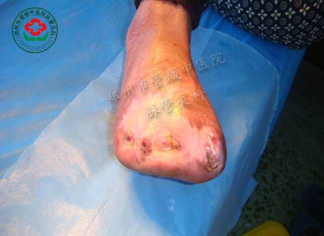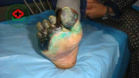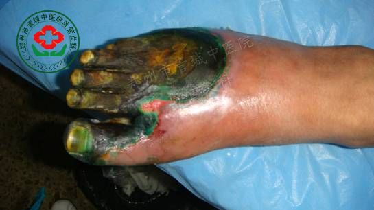 v 入院前治疗经过:患者8年前右小腿内侧无明显诱因出现索条状红肿硬肿块,伴有胀痛,数天后自然消失,后反复间断发作,位置不固定,曾到深圳、广州等多家医院就诊,均以“静脉炎”治疗,效果不佳,病情没得到控制,3个月前,患者右足疼痛厉害,足背皮肤发凉,足趾溃烂,遂到“南昌大学第一附属医院”行“右下肢股动脉大隐静脉人工内瘘成形术”,术后第二天,患者右足五个脚趾全部干性坏死,并延及到足背、足底,随后患者立即转入我院就诊。