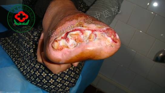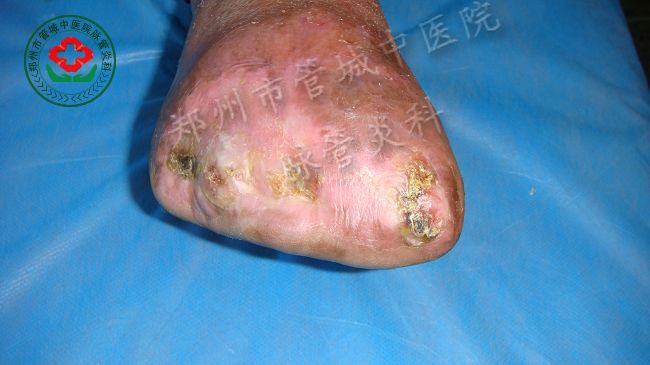 从这照片上我们可以看出,患足溃烂面有两处皮肤已愈合,创面颜色新鲜,四周有上皮组织爬行。