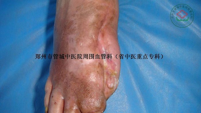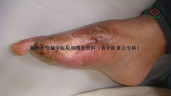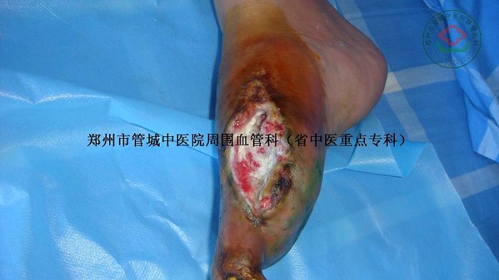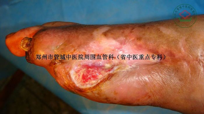 足底肿胀,缝合线脱落,经过多次中药化腐清创术后,患者右足溃口肉芽生长新鲜,并四周有上皮组织生长,第二趾节远端发黑,干枯,溃口面上可见多处淤血。