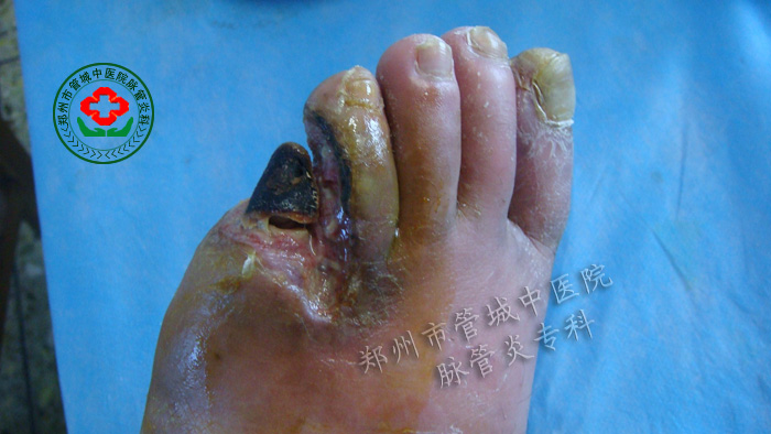 男,30岁,主因“左上肢脉搏消失两年,左足溃烂半年”于2009年4月22日收入院。2006年因左手无脉,先后到娄底铁路医院,湘乡市人民医院,均诊断为“血栓闭塞性脉管炎”,治疗无效。后转入湘雅第一附院治疗效不显。病情继续发展,疼痛加重,夜不能寐。2008年09月左足紫黯,先后多次到湘雅一附院湘雅二附院湘乡二附院等多方治疗,右足溃烂持续进行性加重。于2009年4月19号到我院治疗。入院后查体:患者神志清,精神差,表情痛苦,轮椅推入病房。右下肢明显肿胀,摁之凹陷,左大腿上1/3处32cm,右大腿上1/3处45cm,左小腿中段32cm,右小腿中段40cm。左足小趾发黑干枯欲落,周边溃烂,可见少许淡红肉芽组织,无上皮组织生长。边界清晰,上附脓性分泌物;左足四趾近小趾侧有一处溃烂2.5×1cm;左足大拇指肿胀,皮色暗红;近跖趾关节有一溃面1×1cm,上附黑痂。入院后给予通血保系列药物,配合右下肢外敷,股动脉注射,中药化腐清创处理,清创残骨等治疗后,第五趾溃烂面愈合。