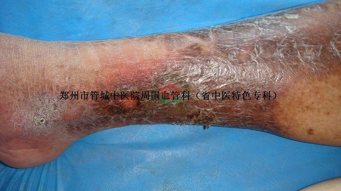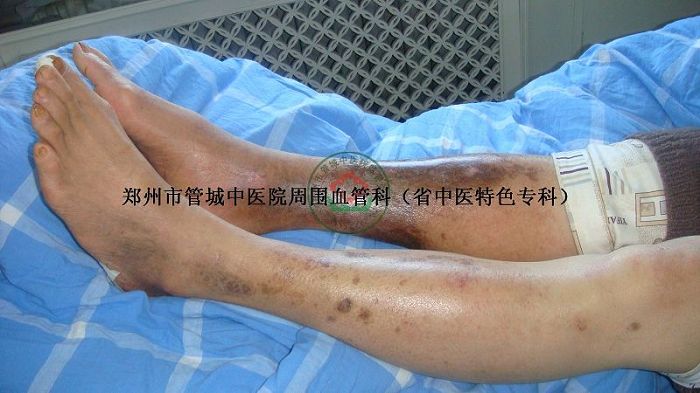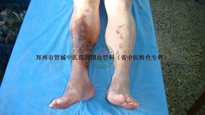 现病史:8年前,患者无明显诱因右下肢肿胀、酸困不适,在当地治疗后效不佳,活动后肿胀加重,右小腿后中下段渐变褐、变黑。右下肢出现瘀斑瘀点。10个月前右下肢溃烂、流水,结痂,反复发作,为求系统治疗,特来我院治疗。