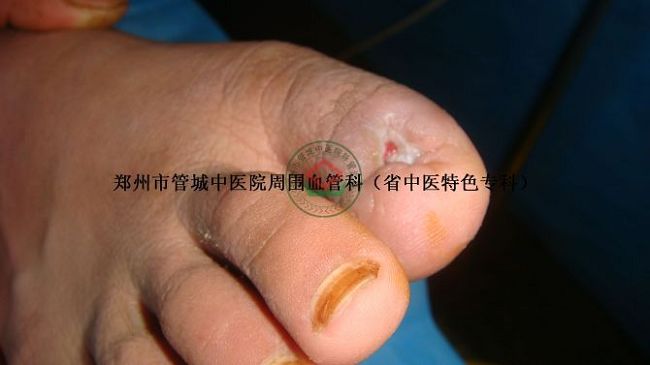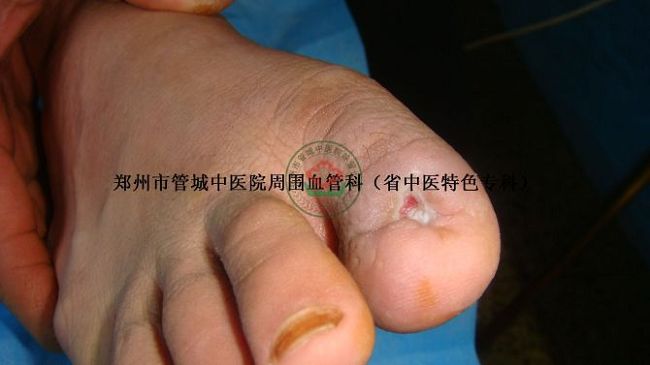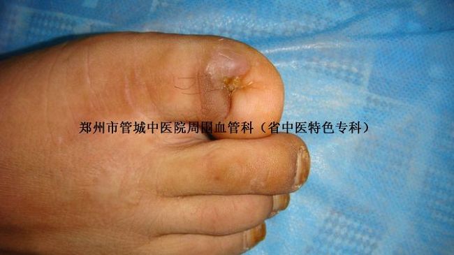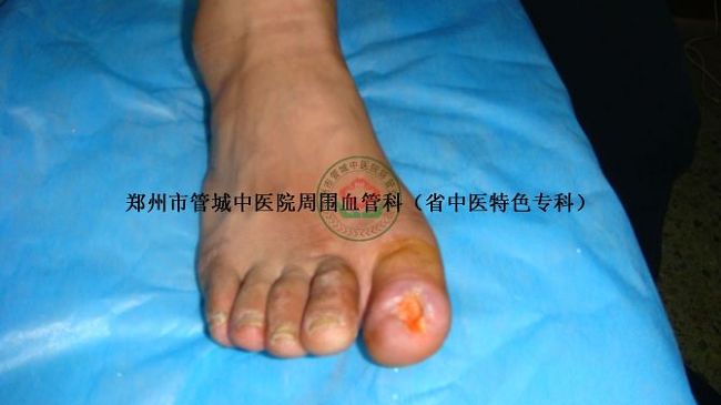 专科检查:右下肢较左下肢纤细,汗毛脱落,趾甲增厚,皮肤干燥脱屑,右足拇趾远端暗红,甲床缺如,表面可见一约0.3x0.6cm溃疡,溃口深,可见骨质暴漏,无新鲜肉芽组织生长,溃周暗红肿胀,双侧国动脉、足背、胫后动脉未触及。