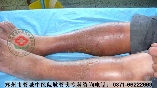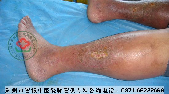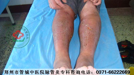 专科检查:双下肢小腿膝下10cm以下到双踝部位暗红,有小丘疹和数个红色出血点和大量的渗出,左右小腿都有大小不等溃烂,无新生肉芽,皮肤发硬,粗糙,颜色发青黑。