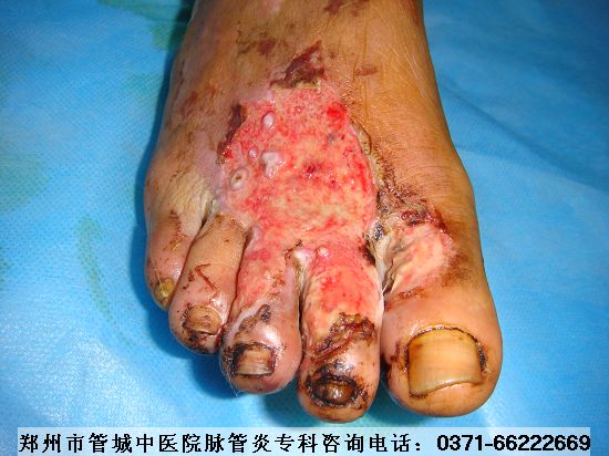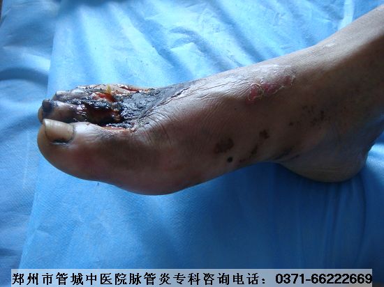 患者八年前出现双手十指怕冷,遇冷后变紫,得温缓解;一年前,左足足趾溃烂,在汕头中心医院治疗(具体不详),溃烂处呈炭黑色坏疽,2011年5月,出现间歇性跛行症状,半个月前手足开始溃烂,持续性疼痛,难以入睡,为求治疗,特来我院。