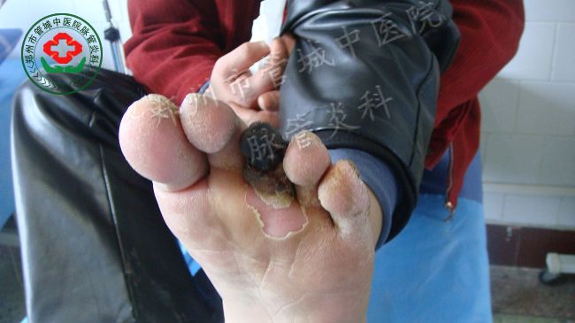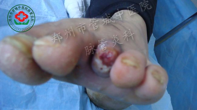 09年三月,患者无明显诱因觉得走路时足底疼痛休息后好转,再次行走时疼痛复现,在当地第二会发医院诊断末梢神经炎,服药治疗后无效,左足感觉发凉、麻木,7月份,第3趾趾端起红肿硬结,疼痛加重,先后中国人民解放军第一五九中心医院及驻马店市中心医院,先后治疗后稍好转,后用地榆粉外用后疼痛加重,12月份左足第三趾清洗后发现足趾发黑,疼痛加重,后经人介绍来我院治疗。