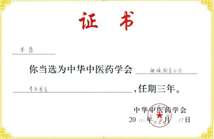 管城中医院周围血管病科主任李霏当选中华中医药学会继续教育分会青年委员证书